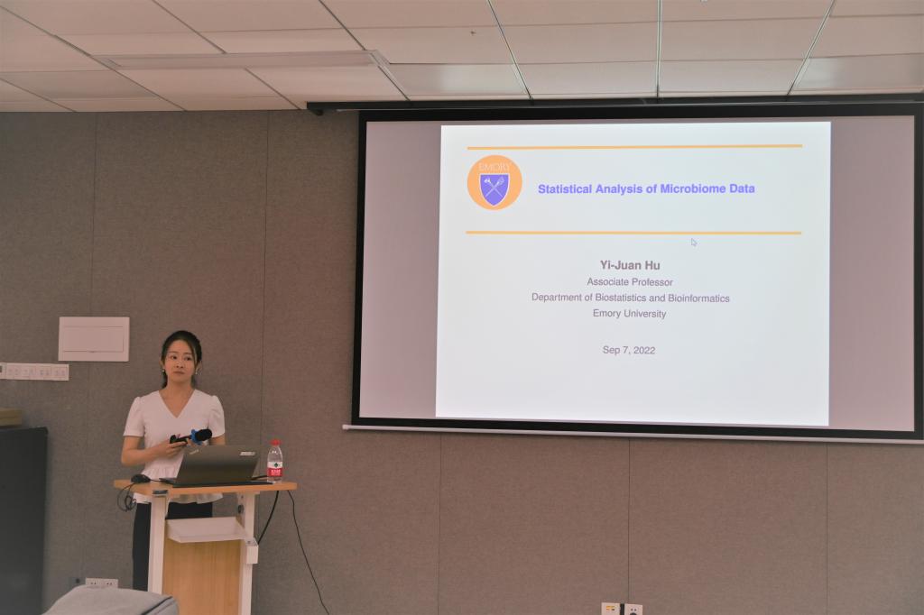 在学术交流环节,来自美国埃默里公共卫生学院的胡懿娟老师以“微生物组数据的统计分析”为题做学术报告。她表示微生物群落的差异与许多疾病有关,而微生物组是建立新的疾病诊断和预后生物标志物以及开发低成本、低风险干预措施的有力对象。她们提出了一种基于线性回归的新方法,该方法考虑了微生物组数据的所有特征,以对差异丰度进行稳健测试,能普遍控制错误发现率,又同时保持高功率。她们用了五个不同的微生物组数据集来展现该方法的广泛应用。