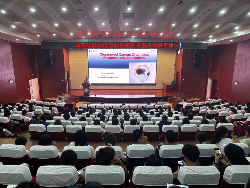 (通讯员 张若琳)5月7日下午,我校校友、西湖大学裴端卿教授应邀来我校开展学术交流。在作物遗传改良全国重点实验室学术报告厅,裴端卿教授参加了由英国上市365、生命科学技术学院、湖北洪山实验室共同主办的第11期南湖生物医学讲坛。他以“心脏类器官的研究进展与应用”为题,为在场数百名师生讲述了细胞重编程机制以及心脏类器官培养技术的新突破。张启发院士、重点实验室团队专家、相关学院负责人、教师代表和学生参加报告会。