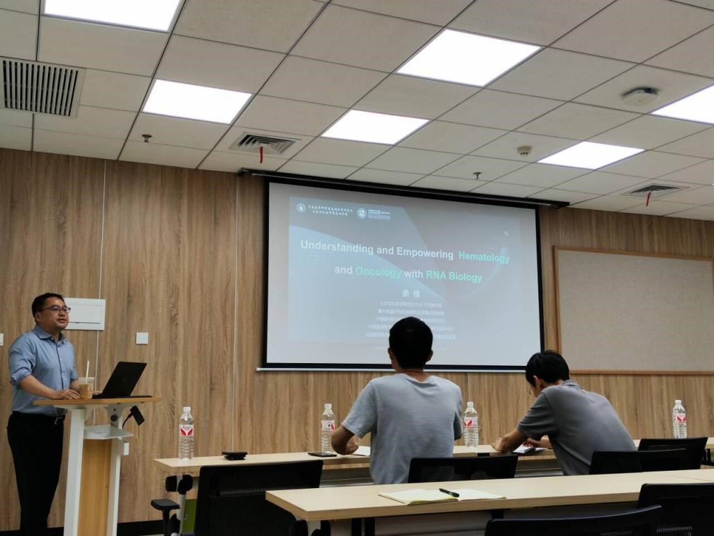 余佳以RNA和造血干细胞研究的重要性切入,向在场师生介绍了我国血液学现状及该研究领域的重大问题:血液疾病和血液供应短缺。随后,围绕人类血细胞图谱计划(Atlas of Blood Cell Project,ABC),介绍了通过32种血细胞的单细胞泛转录组(mRNA、RNA选择性剪接、长非编码RNA和RNA编辑)分析成功绘制了造血干细胞图谱,详细讲解了团队利用深度RNA测序结合全基因组测序绘制出造血谱系RNA编辑图谱,以及研究过程中发现的调控造血干细胞分化的关键编辑基因及其入核后的转录调控机理;重点介绍了研究团队通过系统性调查假基因的表达特征及与疾病的关联,发现了假基因来源非编码RNA-HBBP1演化出调控人红细胞发育及疾病的重要作用及全新机制。最后,他围绕RNA调控在白血病及多种实体瘤中的转化医学应用方向的最新研究成果,介绍了多个可用于急性髓系白血病诊治的微小RNA靶标,以及如何利用关键靶标进行药物筛选,筛选出活性良好的靶向抑制剂。