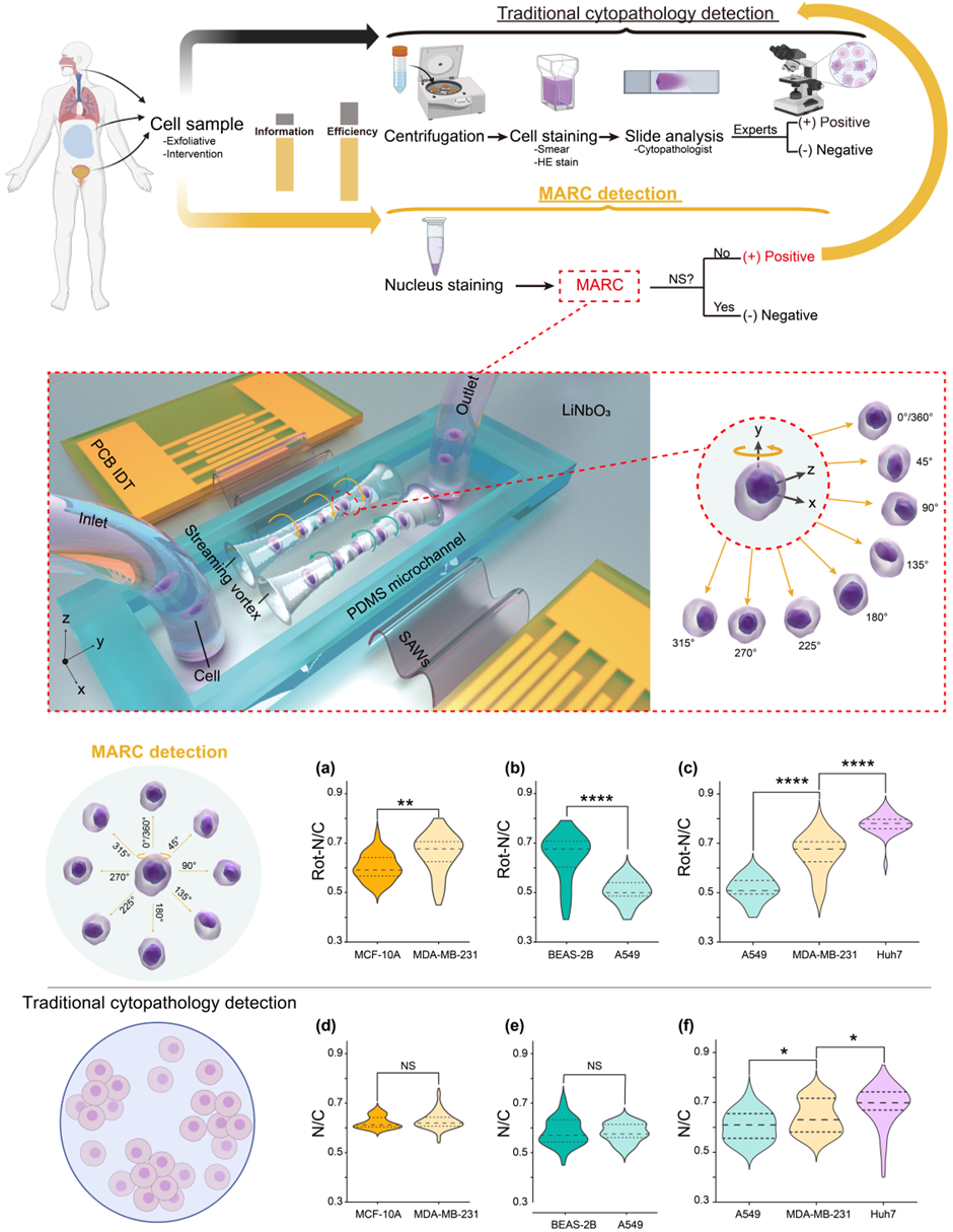 细胞病理学,通过提供细胞水平的疾病诊断信息,在诊断癌症、炎症和感染等疾病中扮演着重要角色。传统检测方法依赖病理学家通过显微镜检查细胞样本的异常形态特征,然而,由于细胞样本处理量大导致传统方法耗时费力,而且传统涂片方法由于观察角度有限常导致检测测结果假阴性,浪费了大量医疗资源。为此,研究团队开发设计了MARC技术,该技术利用声表面波在微通道中捕获并旋转两竖列细胞,操控细胞在多个角度下进行形态学分析。