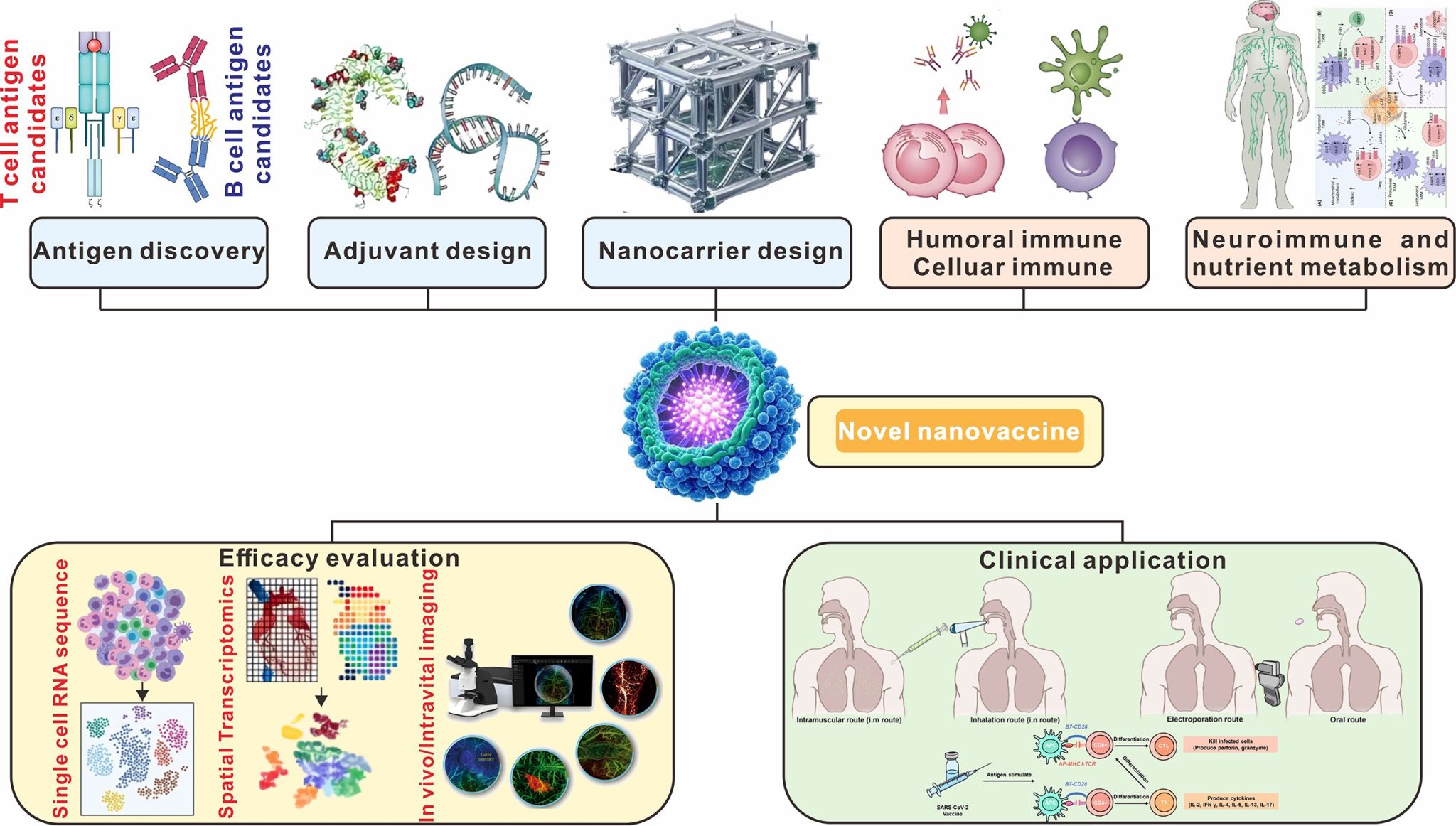 本篇论文首先详细介绍了纳米疫苗抗源筛选策略,即利用多组学整合技术(如NGS、质谱和生物展示平台)精确寻找目标肽段、脂质和翻译后修饰抗原,同时讨论了代谢重编程和信号通路调节B细胞和T细胞激活,以及神经免疫相互作用和营养代谢对免疫系统的调节作用,为提高纳米疫苗效力的提供潜在靶点与策略。另外,通过研究聚焦于筛选合适的纳米材料(如生物可降解聚合物、脂质载体和无机纳米颗粒)和优化抗原型以及采用先进的保存技术(如冻干和抗氧化)可有效提高纳米疫苗的稳定性。本文还比较了传统疫苗与纳米疫苗在佐剂使用上的差异,为新一代佐剂的应用提供新思维。最后一部分阐述了纳米疫苗的评估技术,包括单细胞测序、空间转录组学和活体成像,为免疫动态提供了新见解。