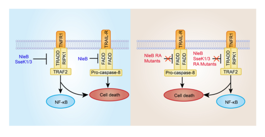 许多革兰氏阴性细菌可利用三型分泌系统(T3SS)将毒力因子(称为效应蛋白)注入宿主细胞,进而操纵宿主细胞的信号传导,以利于病原菌的入侵。李姗教授的前期工作发现三型效应蛋白 NleB 家族,以一种全新的精氨酸 N-乙酰葡萄糖胺化修饰作用于宿主细胞的死亡结构域,从而抑制了宿主死亡受体所介导的细胞死亡(Li et al., Nature, 2013)。随后研究团队又解析了精氨酸N-乙酰葡萄糖胺化修饰后的死亡受体(TRADD-DD和FADD-DD)的晶体结构,揭示了NleB作用于死亡受体家族进而使其发生精氨酸N-乙酰葡萄糖胺化修饰的分子作用机制(Ding et al., Molecular Cell, 2019)。沙门氏菌(Salmonella entrica)分泌的SseK1,SseK2和SseK3属于NleB的同源蛋白,SseK1/2/3同样可以使细胞中的死亡受体及其接头蛋白发生精氨酸N-乙酰葡萄糖胺化修饰。